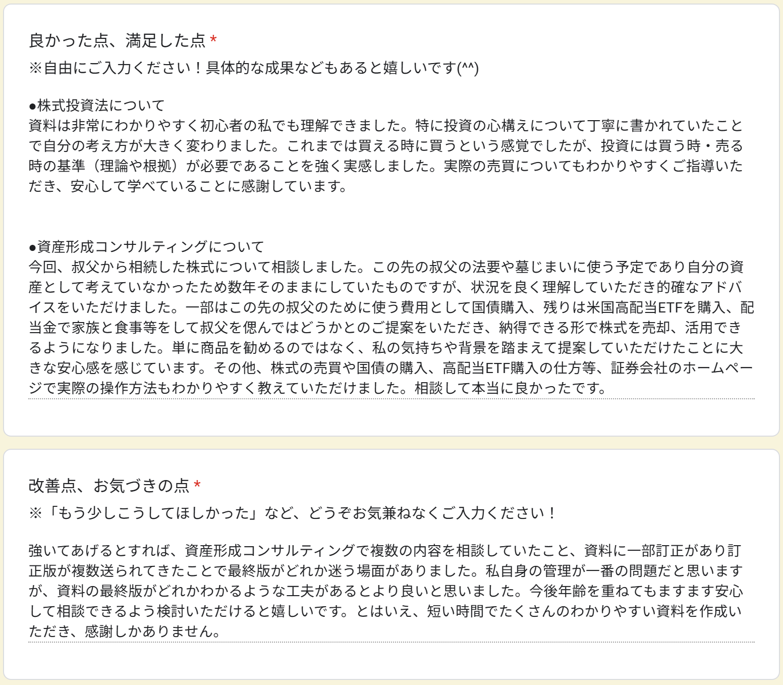 その他、株式の売買や国債の購入、高配当ETF購入の仕方等、証券会社のホームページで実際の操作方法もわかりやすく教えていただけました。相談して本当に良かったです。