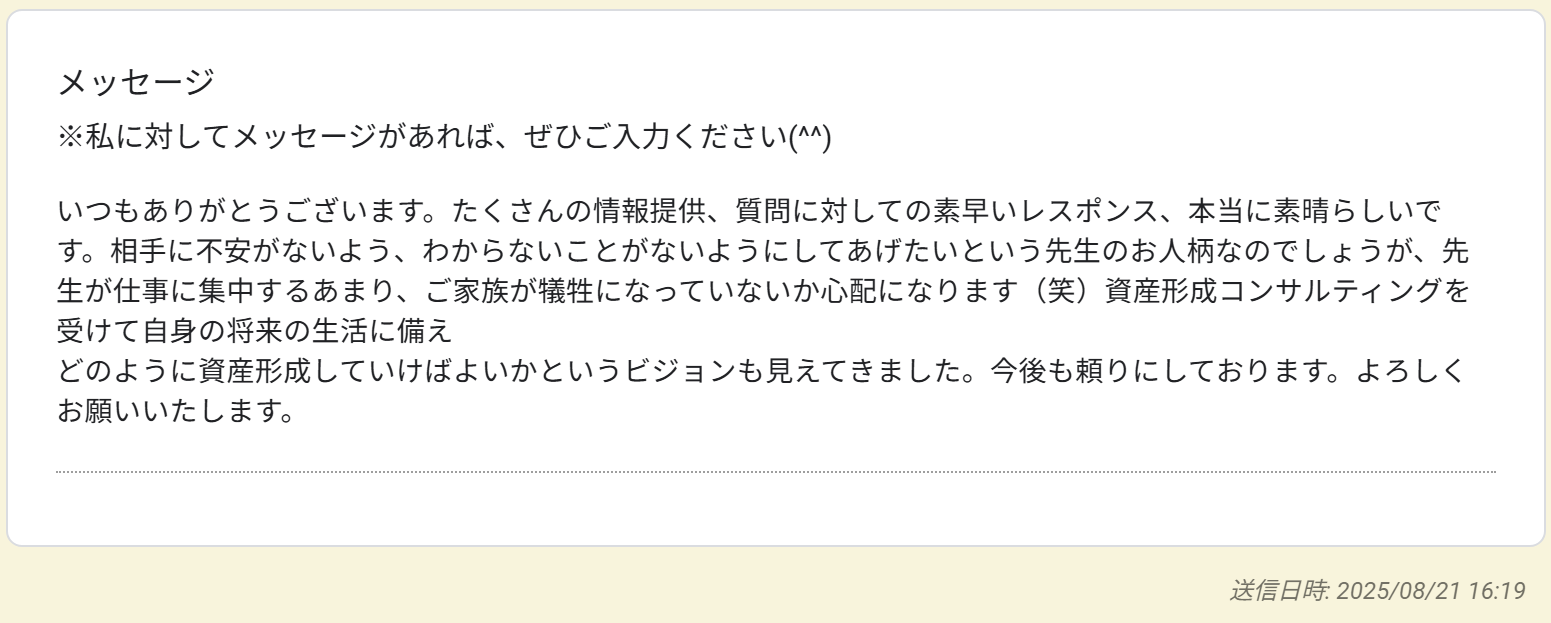 資産形成コンサルティングを受けて自身の将来の生活に備えどのように資産形成していけばよいかというビジョンも見えてきました。