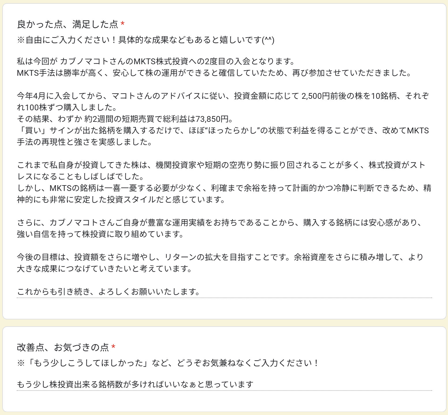 MKTS手法は勝率が高く、安心して株の運用ができると確信していたため、再び参加させていただきました。