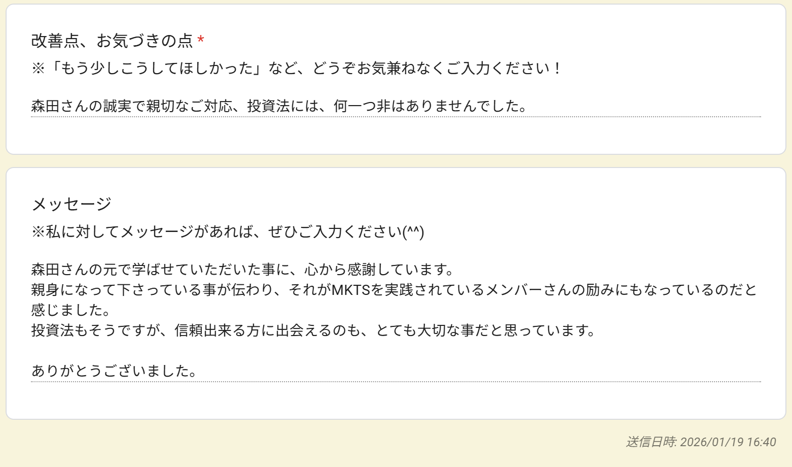 親身になって下さっている事が伝わり、それがMKTSを実践されているメンバーさんの励みにもなっているのだと感じました。