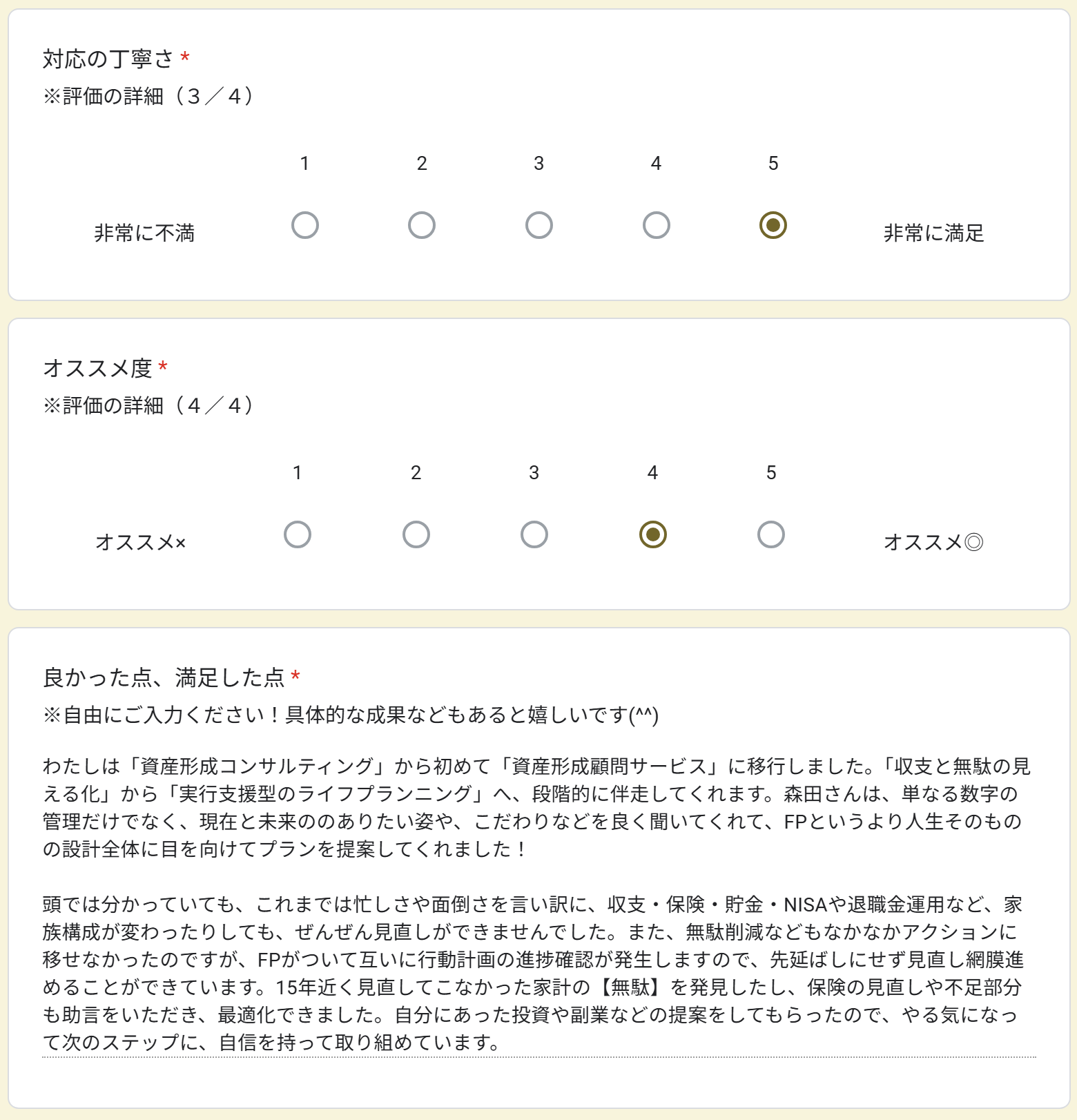 森田さんは、単なる数字の管理だけでなく、現在と未来ののありたい姿や、こだわりなどを良く聞いてくれて、FPというより人生そのものの設計全体に目を向けてプランを提案してくれました!