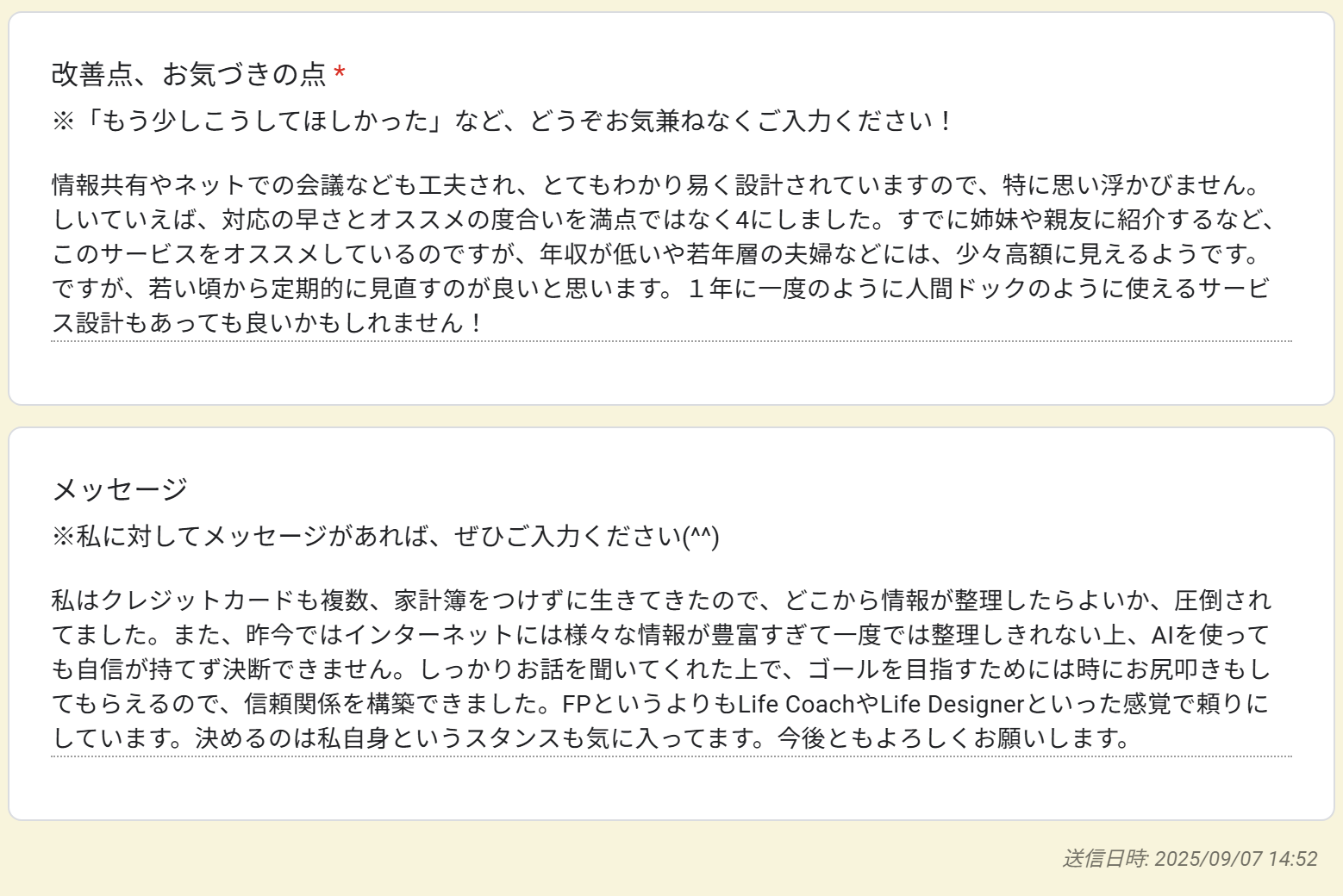 FPというよりもLife CoachやLife Designerといった感覚で頼りにしています。決めるのは私自身というスタンスも気に入ってます。
